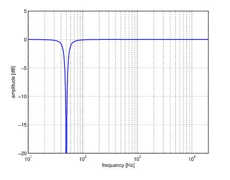 Graph showing the frequency response of a 50Hz audio filter. Note the narrow V-shape of the blocked frequencies.
